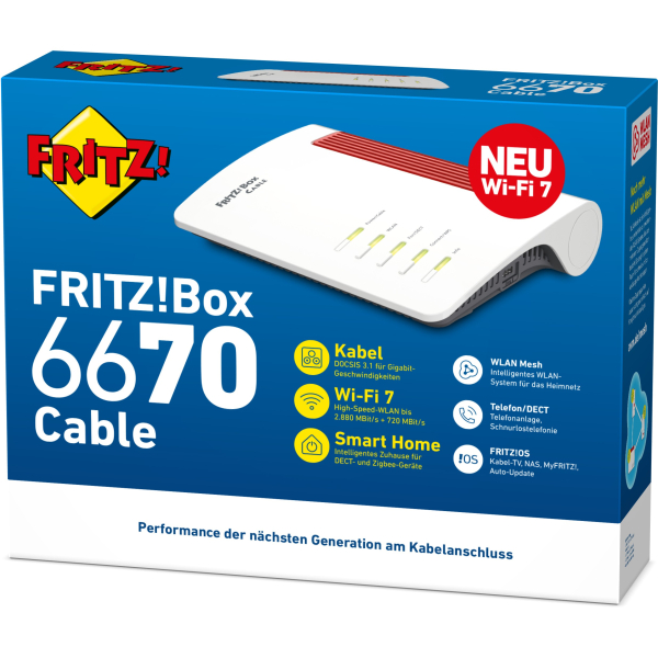 Box 6670. Wi-Fi band: Dual-band (2.4 GHz / 5 GHz), Top Wi-Fi standard: Wi-Fi 7 (802.11be), WLAN data transfer rate (max): 3600 Mbit/s. Ethernet LAN data rates: 10,100,1000,2500 Mbit/s. Security algorithms: IPSec, WPA2, WPA3, WPS. Product type: Tabletop router, Product colour: White. Cables included: Coaxial, LAN (RJ-45)