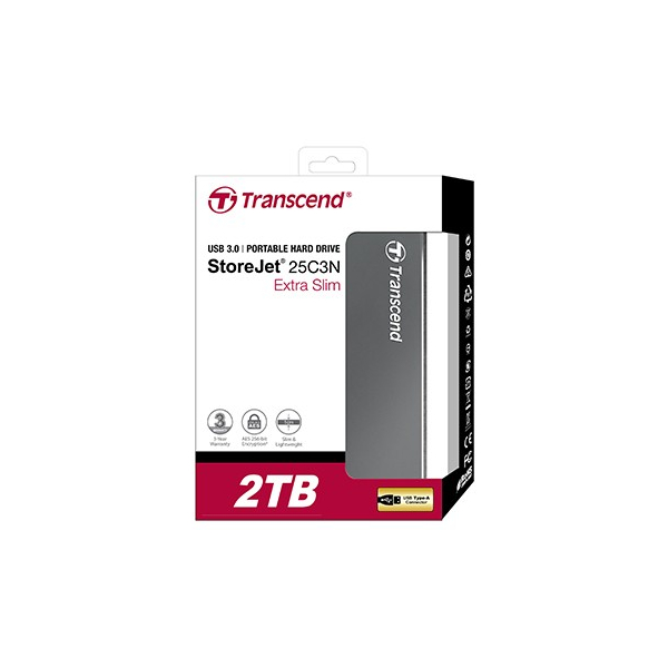 Transcend StoreJet 25C3 është hard drive i jashtëm portativ me kapacitet 2 TB dhe formë 2.5". Përdor lidhje USB 3.0 dhe furnizohet me energji nga USB. Kutia ka ngjyrë gri hekuri, dimensionet janë 78.5 mm x 114.5 mm x 9.95 mm dhe peshon 136 g.