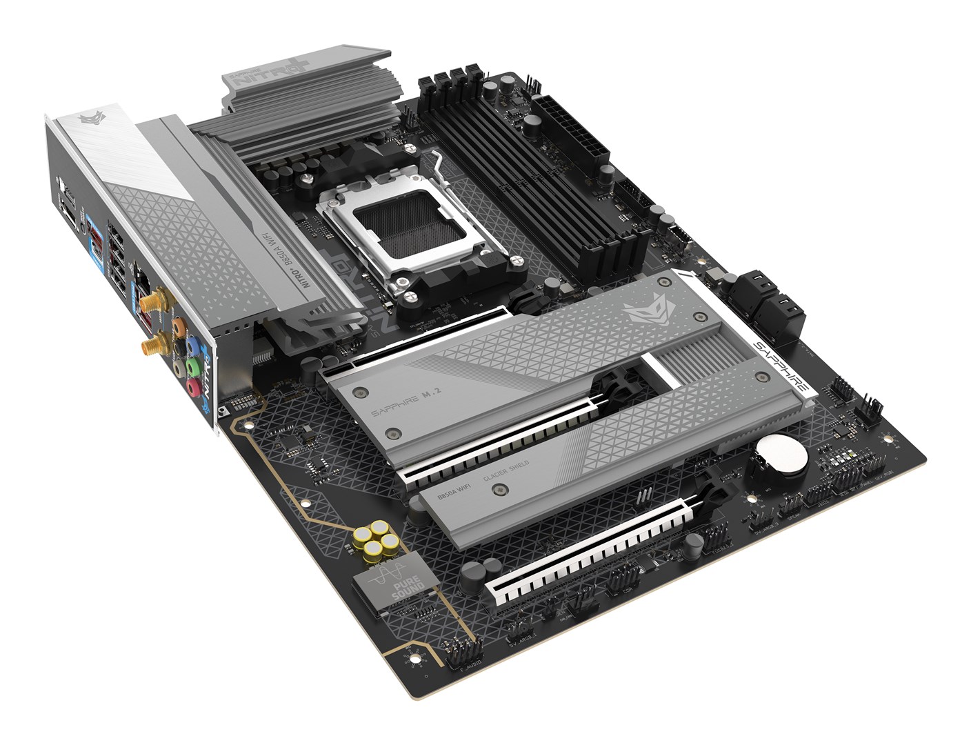 Sapphire NITRO+ B850A WIFI7 – pllakë amë ATX për procesorë AMD me socket AM5 (Ryzen Zen 4). Ofron lidhje moderne me Wi-Fi 7, një port HDMI 1.4 dhe një DisplayPort 1.2 për dalje video. E ndërtuar për stabilitet dhe performancë të lartë, e përshtatshme për sisteme të avancuara desktop me procesorë të gjeneratës së fundit.
